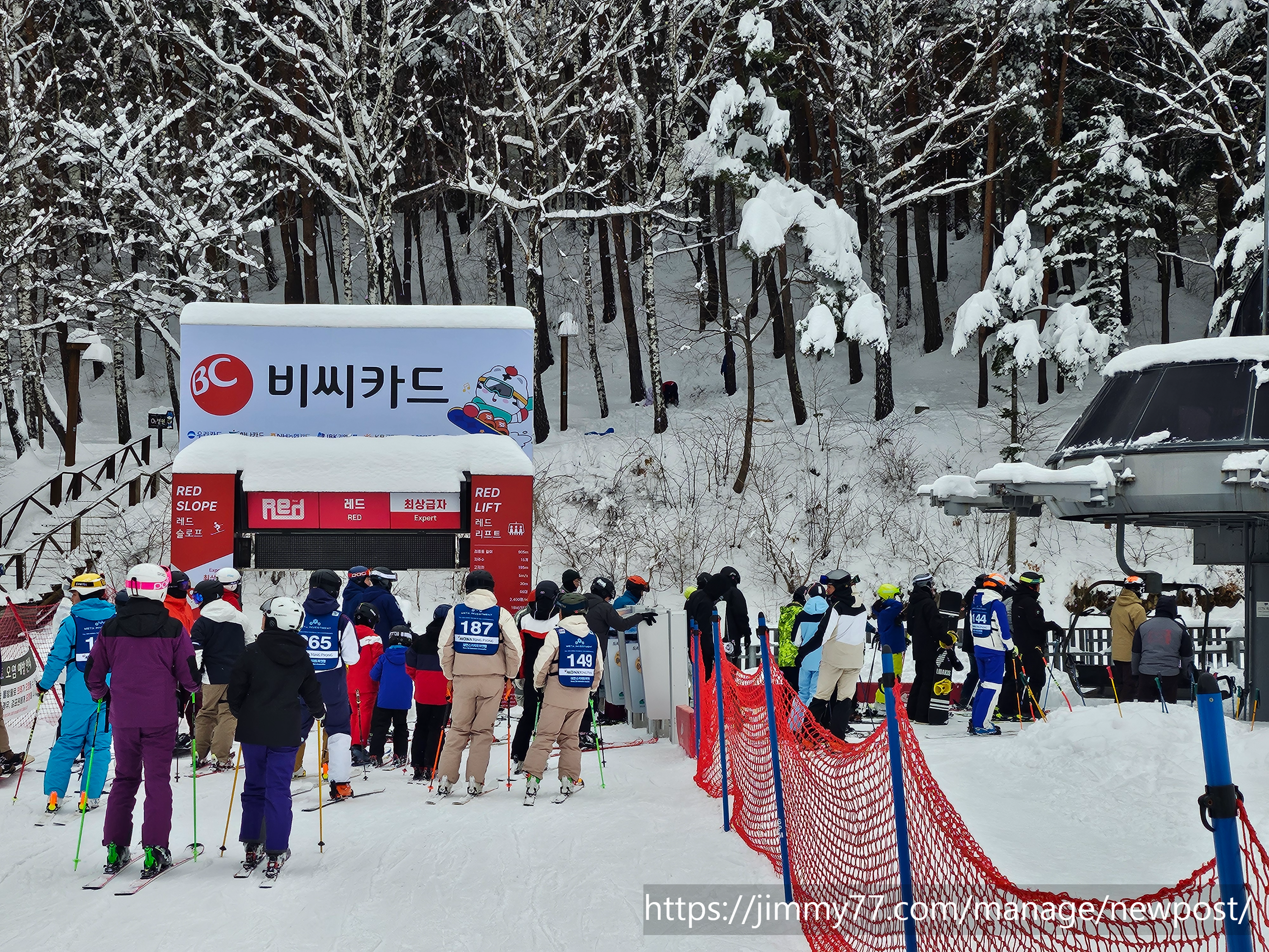 발왕산 꼭대기에서 내려오시는 길은 초. 중급자 분들이 이용하실 수 있는 파라다이스 코스와, 상급자 분들을 위한 레인보우 코스 가있는데요 저희가 방문한 날은 안개도 많고 날씨가 흐려 파라다이스 코스만 이용했어요 용평 스키장에 방문하시면 꼭! 한 번은 타야 하는 필수 코스라고 할 만큼 너무 좋은 코스예요 곤돌라를 기다리던 시간이 아깝지 않게 해 주거든요