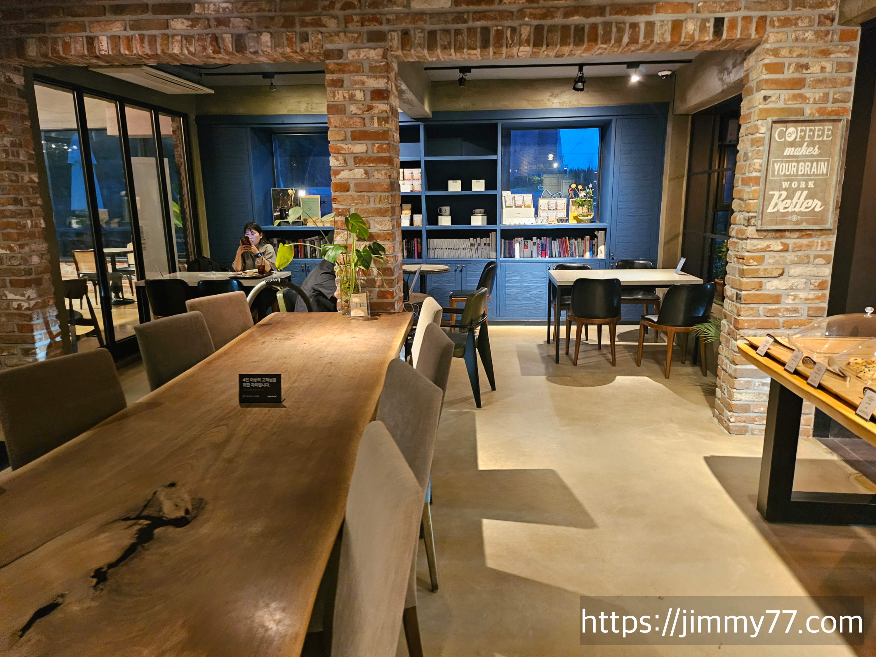 데스크 너머로 커피와 간단한 요리를 할 수 있는 주방이 보이네요 늦은 저녁시간이라 손님은 많지 않았어요 직원분들끼리 삼삼오오 모여 담소를 나누고 계셨어요