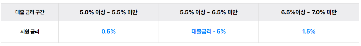 - 지원금액은 대출잔액 × 해당 대출금리구간 지원 이자율